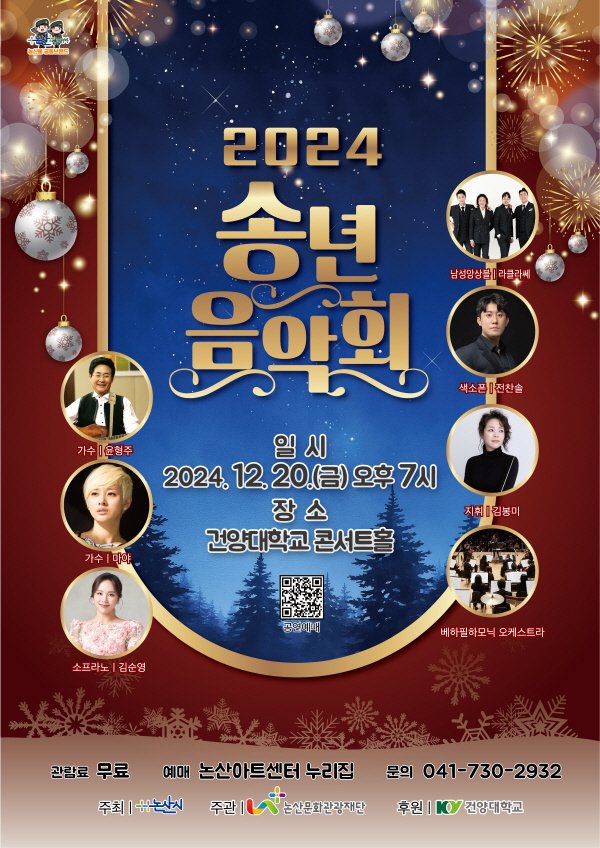 2024 송년 음악회는 다사다난했던 2024년 송년의 아쉬움과 2025년을 맞는 희망을 우수 공연에 담아 시민에게 선보여 문화예술 향유 기회 제공과 논산 시민으로서 자긍심 고취 그리고 소통과 화합의 장을 마련하고자 추진된다.