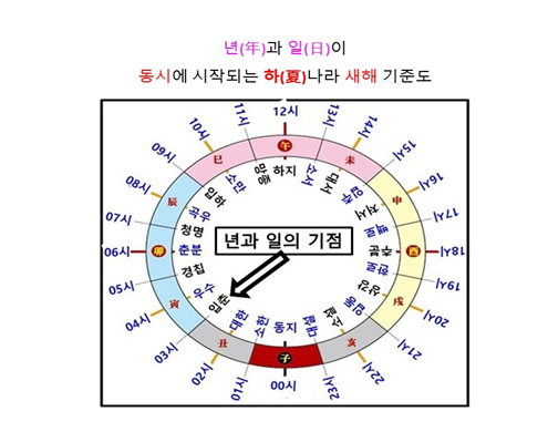 ※ 입춘(立春)으로 새해[歲首]를 정했던 고대 중국 하(夏)나라는 인시(寅時)로 날짜의 시작[日首]을 정했다. 고금의 명리학계와 같이 입춘(立春)으로 새해[歲首]를 정하고 자시(子時)로 날짜의 시작[日首]을 정한 시대는 물론 역법도 없었다.