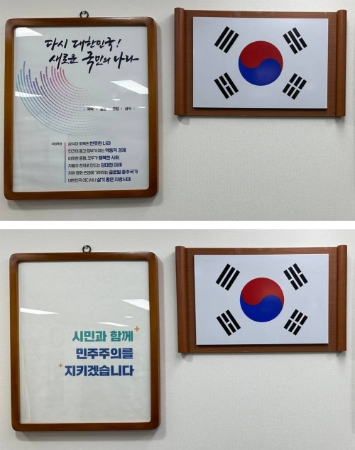 김 청장은 지난 11일 윤석열 정부 국정목표가 담긴 액자를 ‘시민과 함께 민주주의를 지키겠습니다’는 내용의 액자로 교체했다.