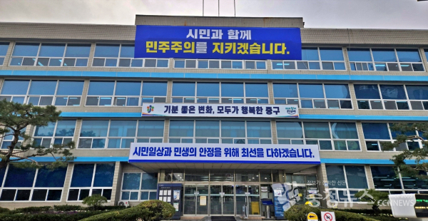 한편 김 청장은 지난 8일 청사 전면에 ‘시민과 함께 민주주의를 지키겠습니다’와 ‘시민일상과 민생의 안전을 위해 최선을 다하겠습니다’라는 현수막 걸어 불안한 정국 속 민생 불안 해소의 뜻을 표했다.