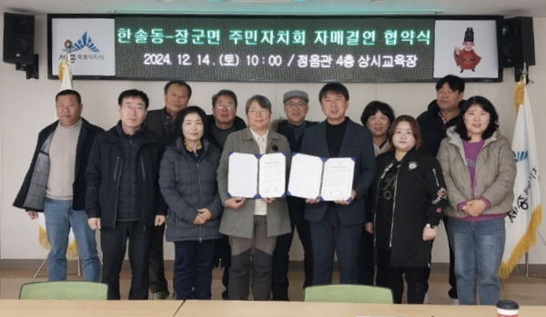 [충청뉴스 최형순 기자] 세종특별자치시 한솔동 주민자치회와 장군면 주민자치회가 지난 14일 한솔동 정음관 상시교육장에서 두 지역 간 우호 증진과 상생 협력을 위한 자매결연 협약을 체결했다.