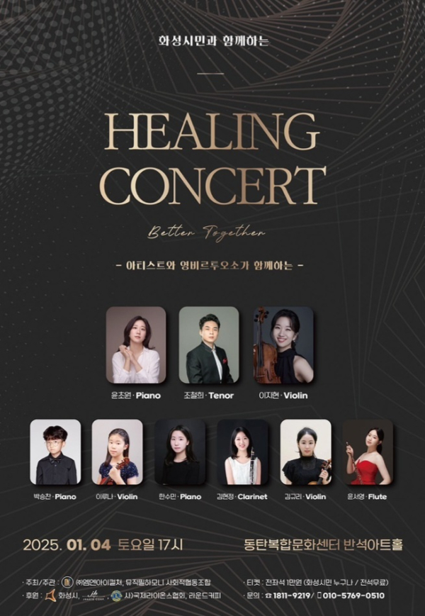[충청뉴스 김용우 기자] 화성지역 문화 예술을 위한 힐링콘서트 (Better Together)가 내년 1월 4일 동탄복합문화센터 반석아트홀에서 개최된다.