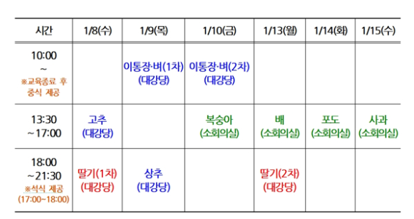 시는 총 10회에 걸쳐 △이통장·벼(2회) △딸기(2회) △고추 △상추 △복숭아 △배 △포도 △사과 등 8개 과정을 개설하고, 약 1,500여명의 농업인을 대상으로 교육을 실시할 예정이다.