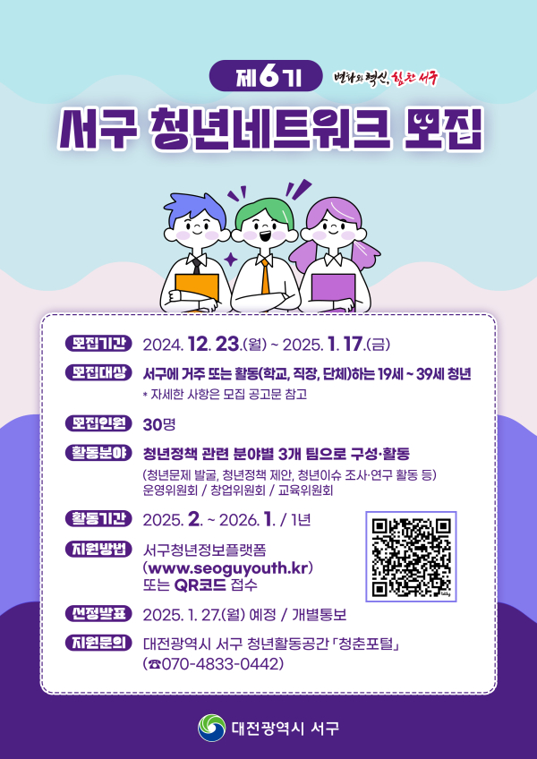 [충청뉴스 박영환 기자] 대전 서구는 청년들이 정책과 청년 문제에 적극적으로 목소리를 낼 수 있도록 ‘제6기 서구 청년네트워크’ 회원을 모집한다고 24일 밝혔다.