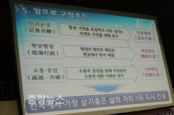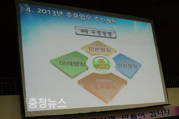 또한 2013년 주요업무 추진계획을 4대 구정방향을 설정하고 신뢰받는 민본행정 찾아가는 현장행정 감동을 주는 창조행정 희망이 있는 미래행정을 설정하고 6대 역점 분야로 복지도시 경제도시 녹색도시 교육도시 안전도시 으뜸도시를 만드는데 최선을 다하겠다고 밝혔다.