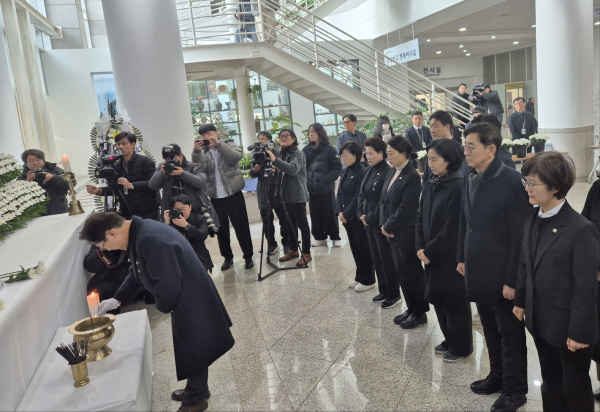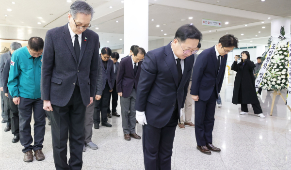 [충청뉴스 김용우 기자] 30일 대전시청 1층에 마련된 '제주항공 여객기 사고 희생자 합동분향소'에 이장우 대전시장과 박범계(서구을) 더불어민주당 의원 등 지역 정치인들의 조문 행렬이 이어지고 있다.