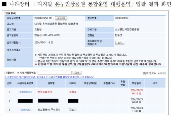 * 입찰심사 결과 붙임참조 (1위: 한국조폐공사, 2위: ****, 3위: 비즈플레이)