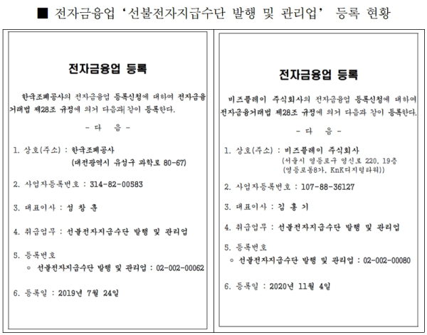 ■ 한국조폐공사 ‘선불전자지급수단 발행 관리업’ 2019년 7월 등록, 비즈플레이사 2020년 11월 등록