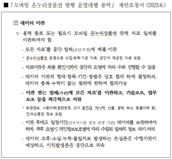 한국조폐공사가 비즈플레이에 ERD를 요청했다는 것이 이관 경험 및 방법론이 부재하다는 것은 아니다. 이는 비즈플레이의 주관적 판단으로 한국조폐공사는 2020~2023년까지 총 41회에 걸쳐 지역사랑상품권 통합관리시스템 및 디지털상품권 플랫폼 이관 경험을 보유하고 있으며, 현재 온누리상품권 데이터 이관과 관련하여 데이터 분할 및 적재 프로그램 개발까지 완료된 상태이다.
