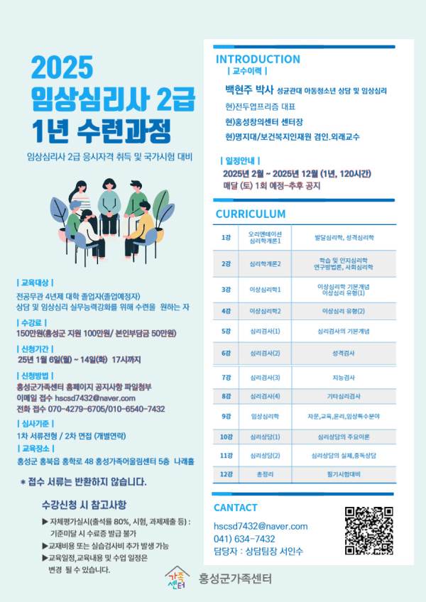 교육과정은 2025년 2월부터 2025년 12월까지 총 12회기로 매월 셋째주 토요일에 운영할 예정이며, 교육 수료자는 임상심리사 2급(국가자격증) 취득 응시자격인 수료증을 받게 된다.