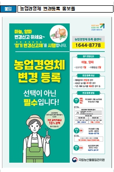 농업경영체법에 따라 농업인은 재배 품목, 면적, 농지 등 중요 정보 변경 시 반드시 변경 신고를 해야 한다.
