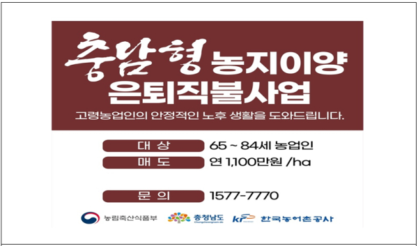 65~84세의 고령 농업인이 3년 이상 소유한 농지를 한국농어촌공사 또는 청년농에게 이양하면 농지 매도 대금에 더하여 직불금을 추가 지급한다. 최대 10년간 1ha당 매도시 연 1,100만원(정부 600만원+충남 500만원)을 받을 수 있다.