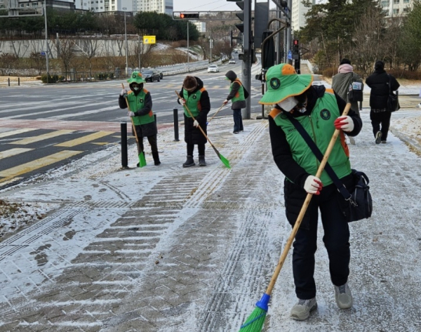 단원들은 소형 스노우 브러쉬, 송풍기, 살포기 등 다양한 장비를 활용하여 눈을 신속하게 제거하고, 도로와 보도에 염화칼슘을 살포하여 미끄럼 방지 작업을 실시했다.