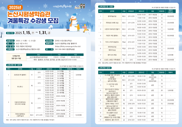 [충청뉴스 논산 = 조홍기 기자] 논산시(시장 백성현)가 오는 15일부터 31일까지 ‘2025년 논산시 평생학습관 겨울특강 프로그램’ 수강생을 선착순 모집한다.