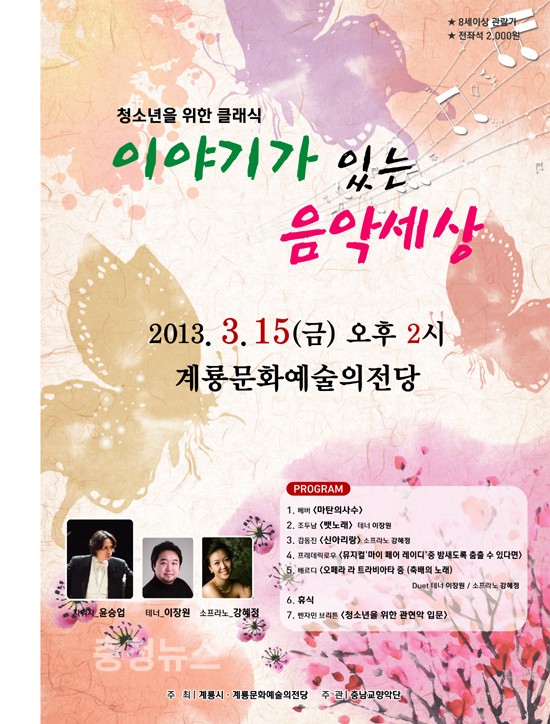 충남교향악단 특별순회공연 오는 15일 오후 2시 계룡시 계룡문화예술의전당 대공연장에서 충남교향악단 특별순회공연 ‘이야기가 있는 음악세상’이 공연된다. ▲ 충남교향악단 공연포스터 이번 공연은 청소년들의 클래식에 대한 이해를 돕기 위한 것으로 ‘벤자민 브리튼’의 '청소년을 위한 관현악 입문'을 통해 클래식 편성 및 악기 등 클래식 전반에 대해 충남교향악단 윤승업 상임지휘자의 설명과 함께 진행된다. 이밖에도 테너 이장원 교수와 소프라노 강혜정 교수의 협연이 진행될 예정으로 기타 궁금한 사항은 계룡시 어울림터사업소(840-3707)로 문의하면 된다. 저작권자 © 충청뉴스 무단전재 및 재배포 금지 최온유 기자 다른기사 보기 기사가 마음에 드셨나요? 충청뉴스 좋은 기사 후원하기 1,000원 3,000원 5,000원 10,000원 30,000원 50,000원 직접입력 비회원 약관동의하기 ※ 소중한 후원금은 더 좋은 기사를 만드는데 쓰겠습니다.