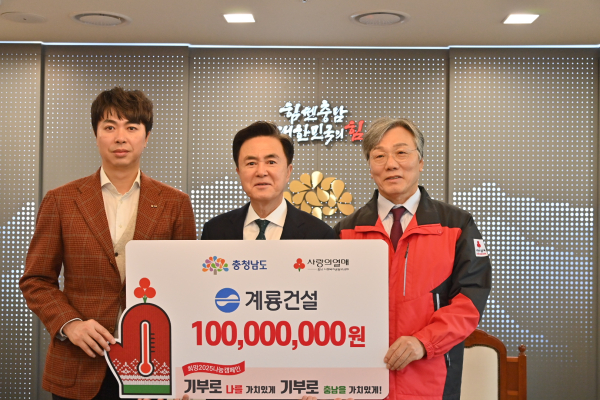 도는 22일 설명절 이웃돕기 성금으로 ▲제이비주식회사 1억 4000만 원 ▲미래엔서해에너지 1억 4000만 원 ▲계룡건설 1억 원 ▲도 소상공인연합회가 600만 원을 기부했다고 밝혔다.