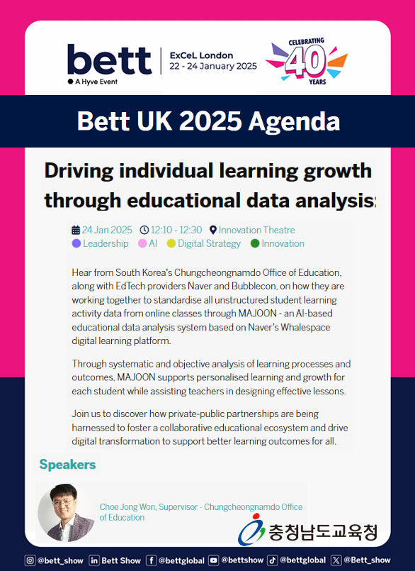 [충청뉴스 권상재 기자] 충남교육청은 매년 영국에서 열리는 세계 최대 규모의 에듀테크 박람회인‘2025 BETT(British Educational Training and Technology) UK(이하 벳쇼)’에 공식 초청을 받아, 국내 최초로 개발한 ‘마주온 교육데이터 분석 시스템’의 우수 사례를 오는 24일 12시에 영국 현지에서 발표한다.