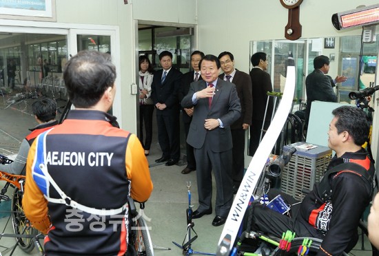 염홍철 대전시장은 20일 월평양궁장을 방문하고, 제94회 전국체전을 대비해 힘든 훈련일정을 소화하고 있는 양궁선수 및 지도자들을 격려하고, 애로 및 건의사항을 청취했다.