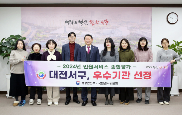[충청뉴스 박영환 기자] 대전 서구는 행정안전부와 국민권익위원회가 주관하는 ‘2024년 민원 서비스 종합평가’에서 우수 등급인 ‘나’등급을 획득했다고 밝혔다.
