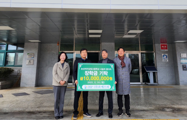 ㈜오에스피는 논산지역을 대표하는 유기농 반려동물 펫푸드 전문 제조업체로 우리나라 축산업의 발전을 선도하며, 해외 시장 개척 공로를 인정받아 프리미엄 펫푸드 전문회사로 인정받았다. 평소 논산여자상업고등학교의 직업교육에 대한 관심과 기업의 이익은 사회에 환원해야 한다는 깊은 뜻을 살려 본교 학생들과 지역사회 발전에 이바지하고자 천만원의 장학금을 기탁하였다.