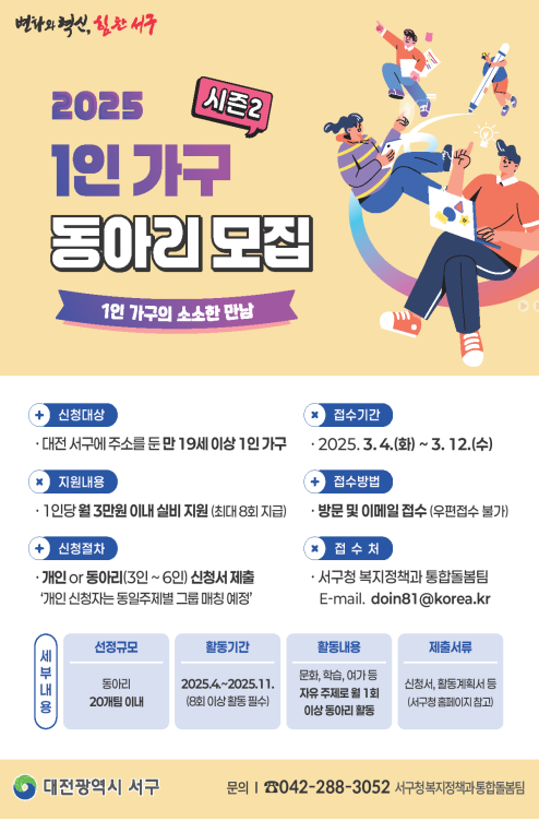 신청 자격은 대전 서구에 주소를 둔 만 19세 이상의 1인 가구로, 독서·운동·봉사 등 동일 주제별로 동아리를 구성한 후, 월 1회 이상 정기적 만남을 통해 사회적 관계망 형성을 지원받을 예정이다.