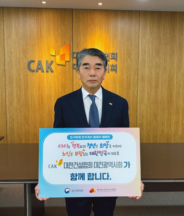 [충청뉴스 김용우 기자] 최문규 대한건설협회 대전시회장은 지난 10일 보건복지부와 한국보건복지인재원이 주관하는 ‘인구문제 인식개선 릴레이 캠페인'에 동참했다.