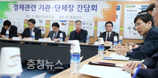 충남도는 28일 충남테크비즈존(KTX천안아산역사)에서 경제 관련 기관·단체장 간담회를 열고, 최근 환율하락이 지역경제에 미치는 영향을 살폈다.