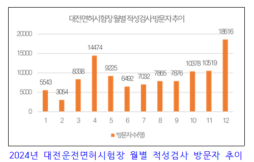 대전운전면허시험장이 제공한 자료에 따르면, 2024년 12월에는 약 1만8천 명이 적성검사를 받으며 가장 혼잡한 시기를 보였다. 반면, 2024년 2월에는 방문자가 3천 명으로 가장 적어 여유롭게 검사를 받을 수 있는 것으로 분석 됐다.