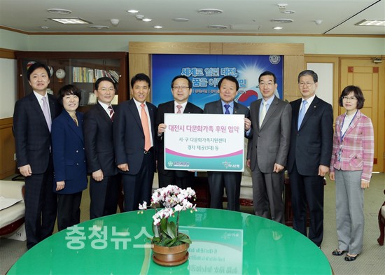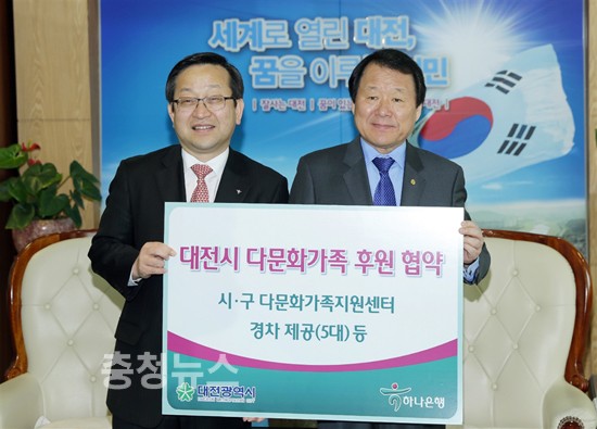 대전시와 하나은행은 29일 오전 시청 응접실에서 염홍철 대전시장, 김종준 하나은행장 등 관계자 10여명이 참석한 가운데‘다문화가족 후원 협약’을 체결했다.