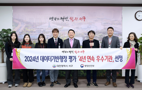[충청뉴스 박영환 기자] 대전 서구가 2024년 행정안전부 주관 ‘데이터기반행정 평가’에서 4년 연속 최고등급인 ‘우수기관’으로 선정됐다고 18일 밝혔다.