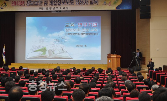 충남교육청은 1일부터 5일까지 도교육청, 남부평생학습관, 학생교육문화원, 서부평생학습관에서 도교육청 전 직원과 지역 유.초.중·고등학교, 직속기관, 도서관 및 지역교육청 정보보안 및 개인정보보호 담당자 1100여명을 대상으로 ‘2013년 정보보안 및 개인정보보호 교육’을 대대적으로 실시한다고 밝혔다.
