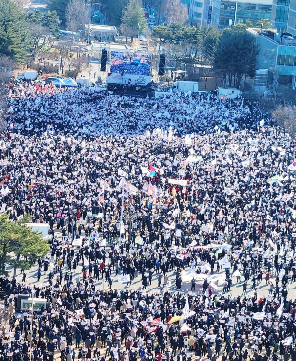 “20만 대전충청인 여러분들이 참석했다. 헌법재판관들이 대한민국 수호를 외치는 목소리가 들리는지 묻고 싶다”며 “이렇게 추운 날씨에 나온 시민들이 왜 여기 나왔을까, 재판관들은 국민들의 요구를 외면하지 말아 달라”고도 했다.
