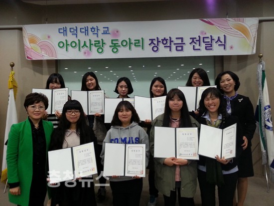 대덕대학교(총장 홍성표) 영유아보육과의 전공동아리 ‘아이사랑’(회장 황금남)은 2일 오후 학과 강의실에서 지난해 10월 ‘작은 음악카페’를 열어 마련한 장학금 400만원을 8명의 학우들에게 전달했다.