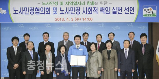 대전 대덕구(구청장 정용기)는 3일 구청 중회의실에서 노사민정 협의회 위원22명이 참석한 가운데 2013년 사업계획 심의·의결과 '노사민정 공동 사회적 책임 실천 선언문'을 채택했다고 밝혔다.