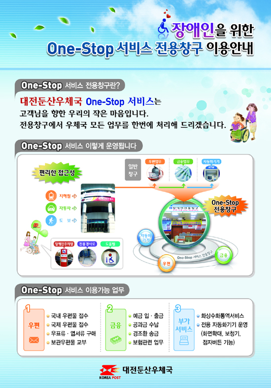 'One-stop 전용창구'는 장애인과 노약자 등이 불편함이 없도록 우편·금융·자동화업무를 한 번에 해결할 수 있도록 했으며 또한 우체국의 접근성 강화를 위해 시설개선 등을 중심으로 각종 편의시설을 보완했다.