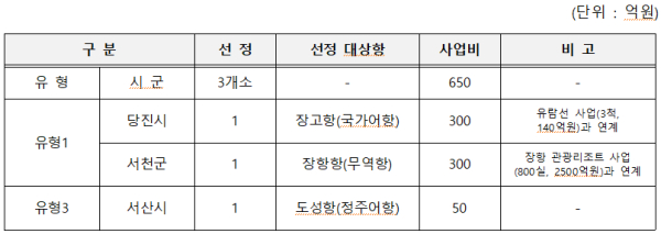 도내 3개 어촌지역은 ▲유형1 당진 장고항, 서천 장항항 ▲유형3 서산 도성항이며 2029년까지 650억 원이 투입될 예정이다.