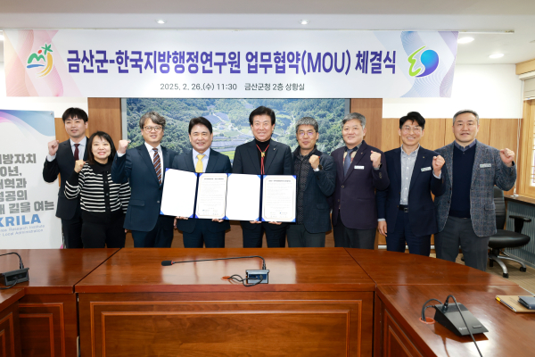 [충청뉴스 금산 = 조홍기 기자] 금산군과 한국지방행정연구원은 지난 26일 금산군청에서 박범인 금산군수, 육동일 한국지방행정연구원장을 비롯한 임직원들이 참석한 가운데 업무협약을 체결했다.