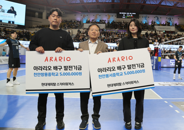 아라리오는 지난 26일 천안 유관순체육관에서 열린 현대캐피탈 스카이워커스 배구단 홈경기에서 천안 봉서중·쌍용중학교 배구부에 각각 500만 원을 전달했다.