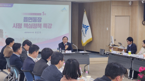 최민호 시장은 회의에 앞서 '세종사랑운동'과 '시정 5대 비전'을 주제로 특강을 진행하며, 읍면동장들에게 시민과의 적극적인 소통을 당부했다.