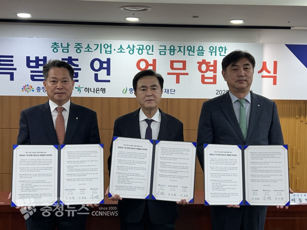 김태흠 충남지사는 5일 도청 상황실에서 이동열 하나은행 부행장, 조소행 충남신용보증재단 이사장과 ‘중소기업·소상공인 금융 지원을 위한 특별출연 업무협약’을 체결했다.