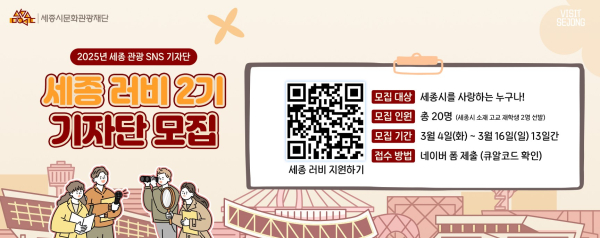[충청뉴스 최형순 기자] 세종시문화관광재단(대표이사 박영국)은 2025년 세종 관광 SNS 기자단 '세종 러비 2기'를 3월 4일부터 16일까지 모집한다.