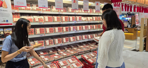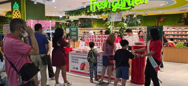 논산시(시장 백성현)는 인도네시아 자카르타시 코타카사블랑카 센트럴파크 몰 내 TransMart 매장에 마련된 ‘논산딸기 특별 판매’공간이 연일 딸기를 사기 위한 현지인들로 북적이고 있다고 전했다.