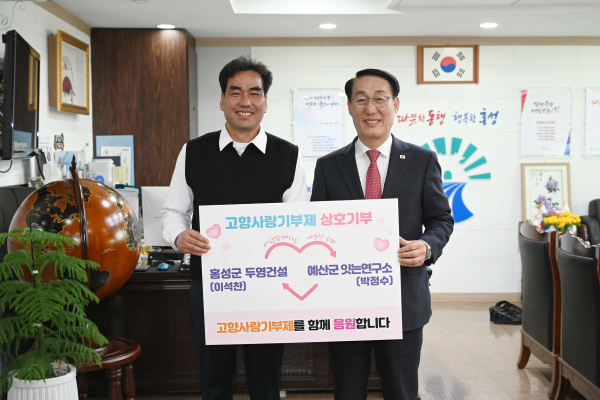[충청뉴스 권상재 기자] 홍성군과 예산군이 지난 7일 홍성군의 ‘두영건설’과 예산군의 ‘잇는연구소’ 두 업체 간의 고향사랑 기부금 전달로 이웃 지자체 간 상호 기부의 시작을 알렸다.