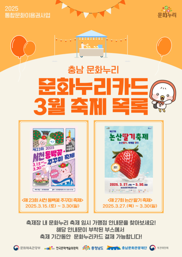 해당 축제는 ▲제23회 서천 동백꽃 주꾸미 축제(3월 15~30일) ▲제27회 논산 딸기 축제(3월 27~30일)이다. 축제기간 동안 축제장 내 ‘문화누리카드 가맹점 안내문’이 부착된 부스에서 문화누리카드를 사용할 수 있다.