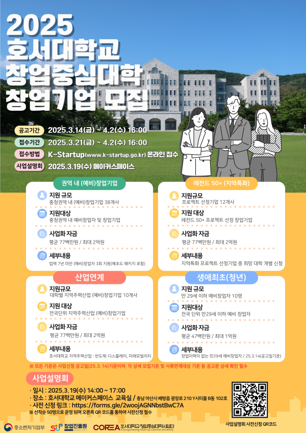 호서대가 보유한 첨단 연구시설과 창업 인프라를 제공한다. 지원 자금은 최대 2억 원이다.