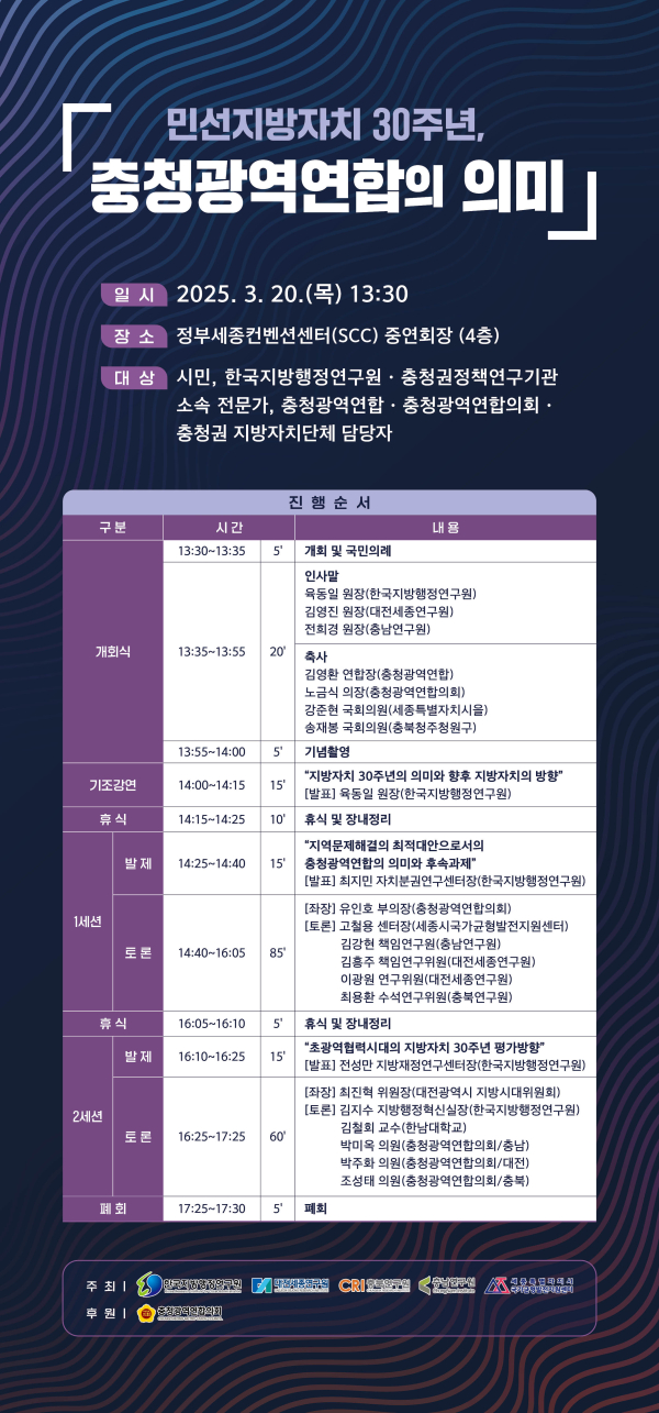 이번 토론회는 한국지방행정연구원, 대전세종연구원, 충남연구원, 충북연구원, 세종특별자치시 국가균형발전지원센터가 공동 주최 및 주관하고, 충청광역연합의회가 후원한다.