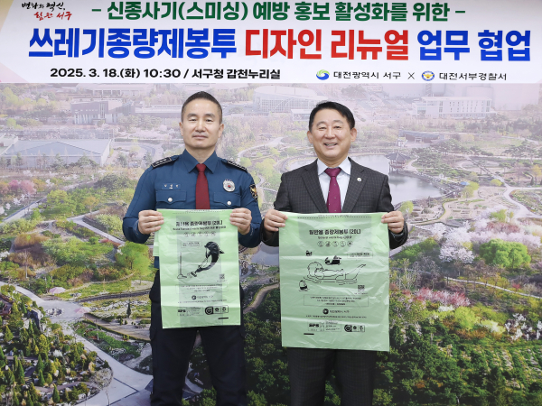[충청뉴스 박영환 기자] 대전 서구청는 지난 18일 구청 갑천누리실에서 대전서부경찰서와 쓰레기 불법투기 과태료 관련 스미싱 예방을 위한 업무 협업을 체결했다고 밝혔다.