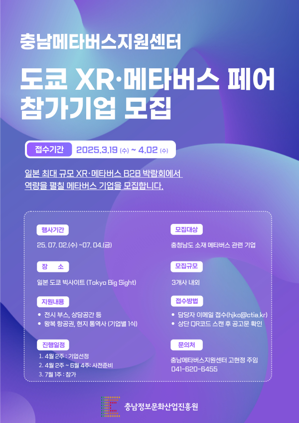 [충청뉴스 박동혁 기자] 충남정보문화산업진흥원(진흥원)은 ‘2025 도쿄 XR·메타버스 페어’ 참가기업을 모집한다고 19일 밝혔다.