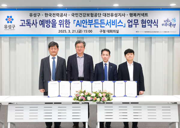 [충청뉴스 박영환 기자] 대전 유성구는 21일 한국전력공사(대전세종충남본부장 신경휴), 국민건강보험공단(대전유성지사장 이용수), 행복커넥트(AI Care광역사업팀장 오만석)와 ‘AI안부든든서비스’ 업무협약을 체결했다.