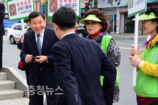 구는 18일 중구청 후문 지하철역 입구에서 박용갑 중구청장을 비롯, 환경과 직원들과 30명의 중구그린리더가 참여한 가운데 '담배꽁초 안 버리기' 캠페인을 전개했다.